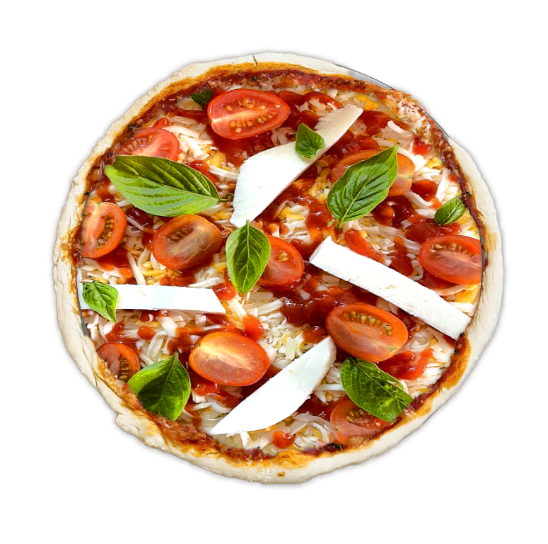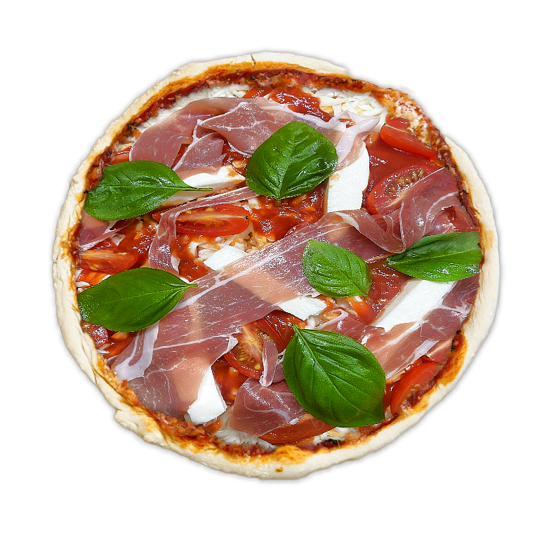 Prosciutto, Cherry tomatoes, mozzarella fresco, Basil y queso en Salsa Roja